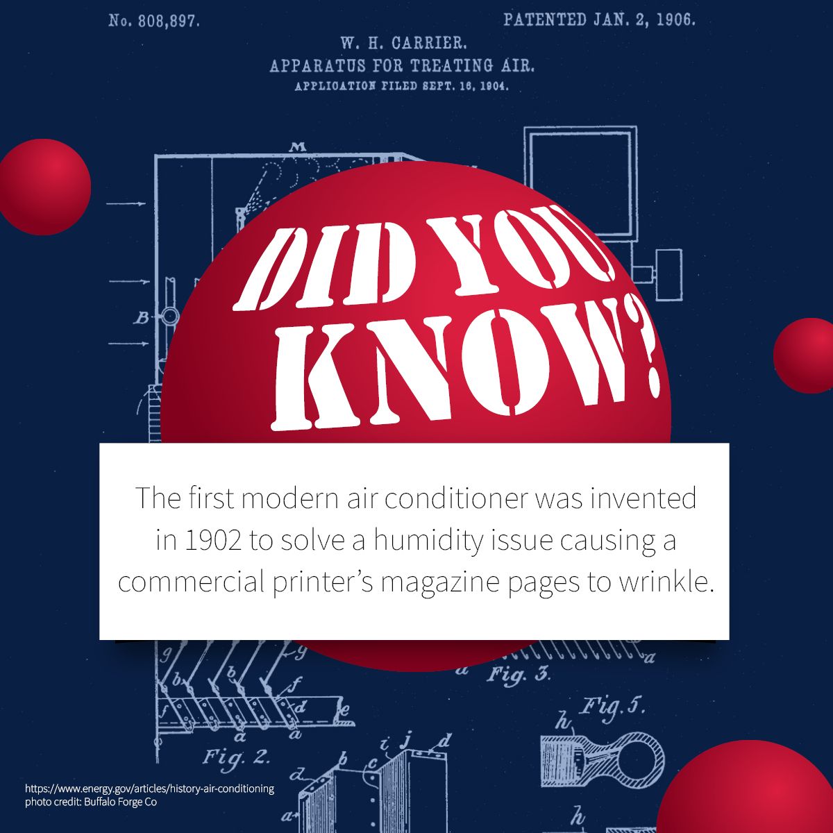 The first modern air conditioner was invented in 1902 to solve a humidity issue causing a commercial printer’s magazine pages to wrinkle.