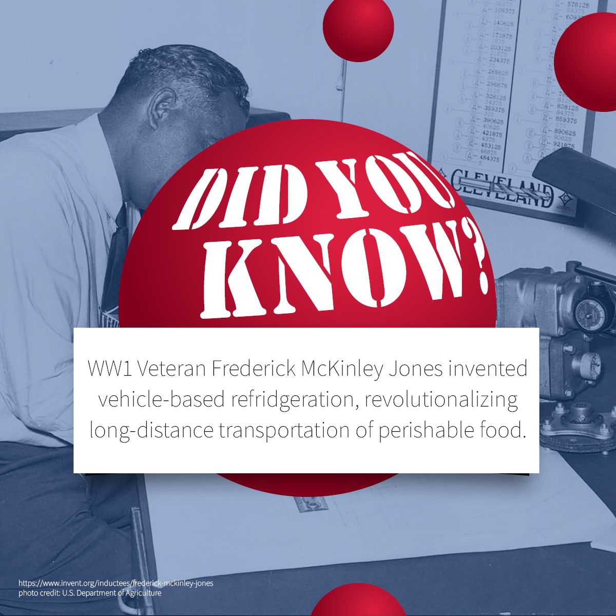 Ohio native and veteran Frederick McKinley Jones invented the first mobile air conditioner. His vehicle-based innovation transformed how perishable goods are delivered across the country, ensuring freshness and quality for all. As a result, he became the first Black member of the American Society of Refrigeration Engineers and was the first Black American to be awarded with the National Medal of Technology.